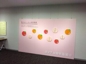見どころ③ フルーツ型パネルをスライドすると、漢字と意味が現れる「音がおもしろい四字熟語」展示